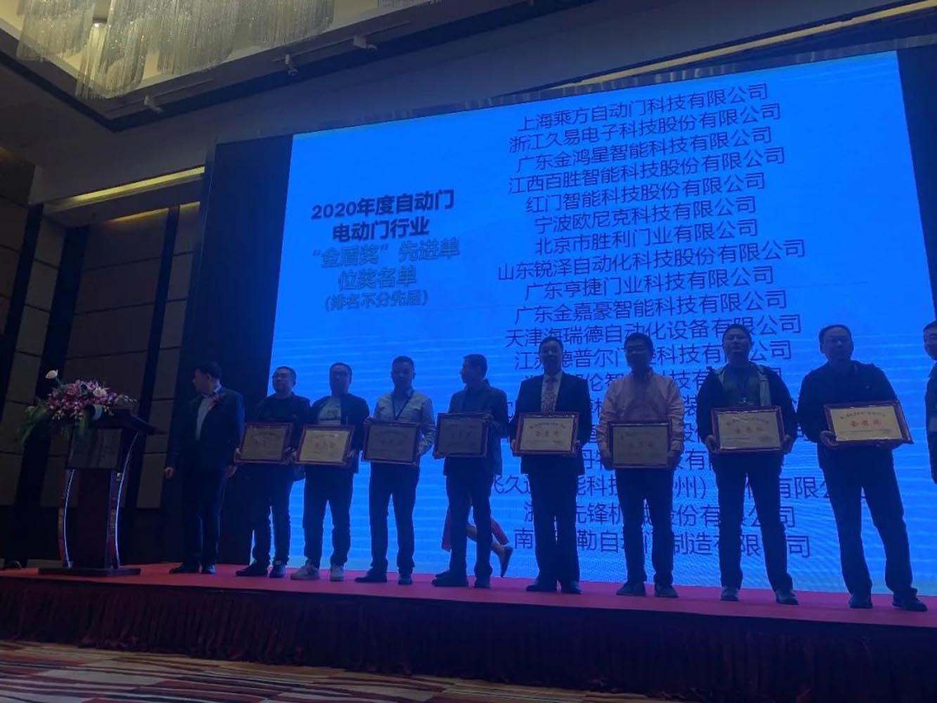 “新時(shí)代、新理想、新征程”——2021‘全國(guó)自動(dòng)門電動(dòng)門行業(yè)年會(huì)在北京盛大召開(kāi),金鴻星憑借在經(jīng)濟(jì)效益、社會(huì)效益、經(jīng)營(yíng)管理、科技創(chuàng)新等方面強(qiáng)勁的綜合實(shí)力,在年會(huì)上再次榮膺“金盾獎(jiǎng)‘先進(jìn)單位’”